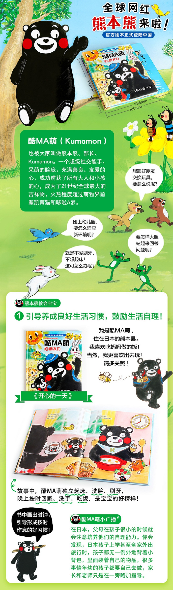 这是一本宝宝社交能力养成故事绘本。讲述熊本熊一天生活的故事。熊本熊早上起来,先和太阳公公打了个招呼,洗漱完毕后就出去玩了。和朋友们一起玩游戏、一起野餐、一起睡午觉……过的充实有趣,真是快乐开心的一天。