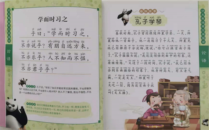 这是一套国学启蒙读物。丛书利用功夫熊猫阿宝的形象以及电影功夫熊猫中的中国元素,帮助小读者阅读中国国学经典。丛书图文并茂,通俗浅显。除了原文之外,配上了解析和妈妈讲读等环节,此外,还通过简单有趣的历史故事,帮助孩子更好地理解国学经典。其中,《论语》这本分四个部分展示了论语的内容。
