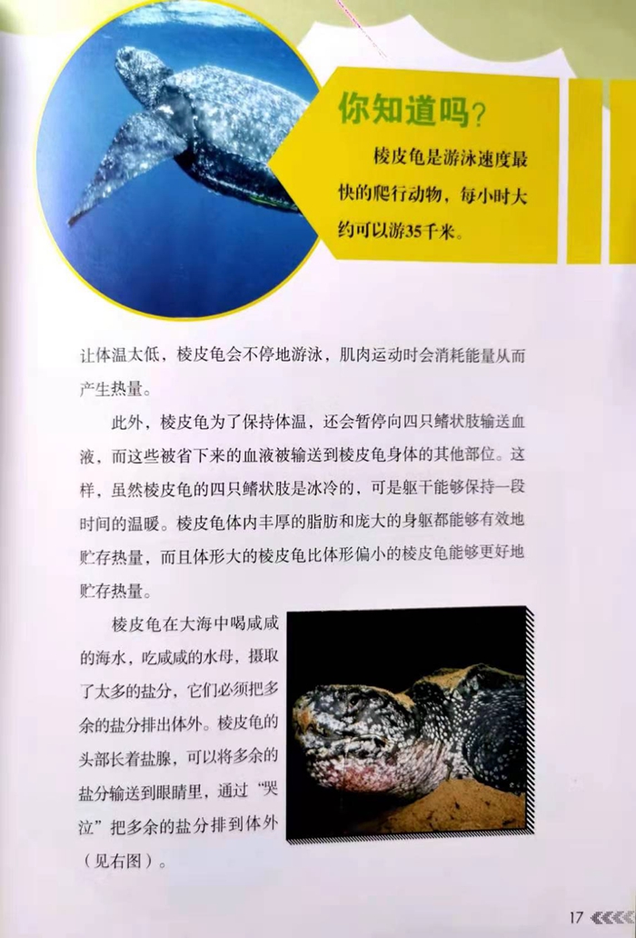 棱皮龟和蛇、乌龟、蜥蜴、鳄鱼一样都是爬行动物。爬行动物有三个非常典型的特征:,它们都是脊椎动物,也就是说它们都长有脊椎;第二,它们浑身都覆盖着鳞片;第三,它们都是变温动物,在烈日的照耀下它们的体温会升高,而在凉水的浸泡中它们的体温又会下降。这三点是所有爬行动物都具备的共同点。