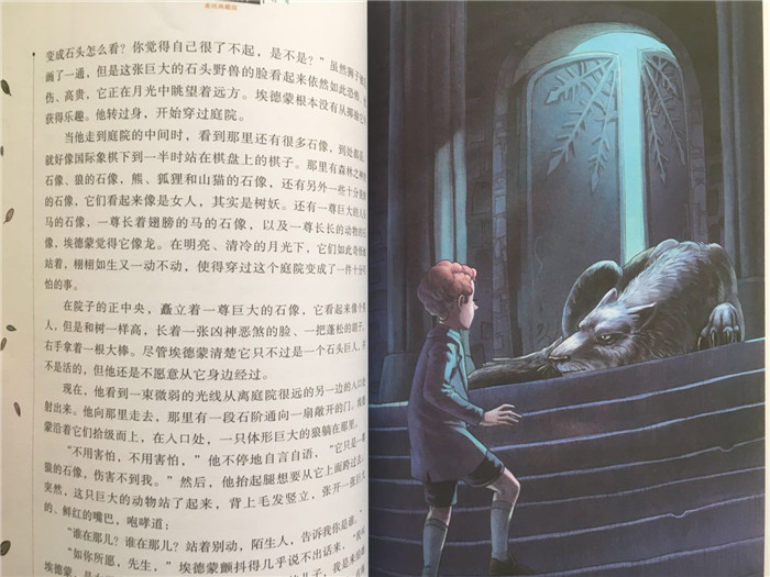 探头望进去,她看到了几件悬挂的大衣,大都是长长的毛皮外套。露茜最喜欢毛皮的气味和手感了。她很快就踏进了衣橱,钻到这些大衣里面,用脸轻轻地在上面蹭啊、蹭啊。当然,衣橱的门还是开着的,因为她知道把自己一个人关进衣橱里是很愚蠢的。接着她向里走,发现在第一排大衣的后面还悬挂着第二排大衣。里面的光线非常暗,她把胳膊伸在前面,免得自己的脸撞到衣橱的后面。露茜又向前迈了一步,然后两步、三步,一直期待着自己的指尖触摸到木板,可是怎么也触不到。“这一定是一个非常大的衣橱!”露茜心里想着,继续向里走,把一层层柔软的大衣推向两边给自己腾出点儿地方。不一会儿,她注意到自己的脚下有什么东西被踩碎了。