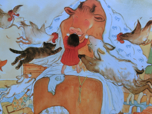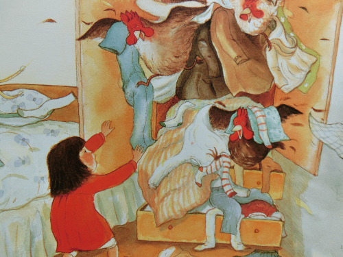 画家似乎刻意地把爸爸劳动的场面缩成小图,而把松利和动物们玩耍的画面扩为整页;不但如此,随着画面中的场景一页比一页杂乱,松利和动物们的快乐程度一页比一页加深,直到最后全部爆发——松利和想象中的动物们一齐向我们跳来,好像要冲出画面,达到心情释放的极致,这似乎也在暗示着日常生活中的孩子是多么需要精神上的关心和情感上的陪伴。