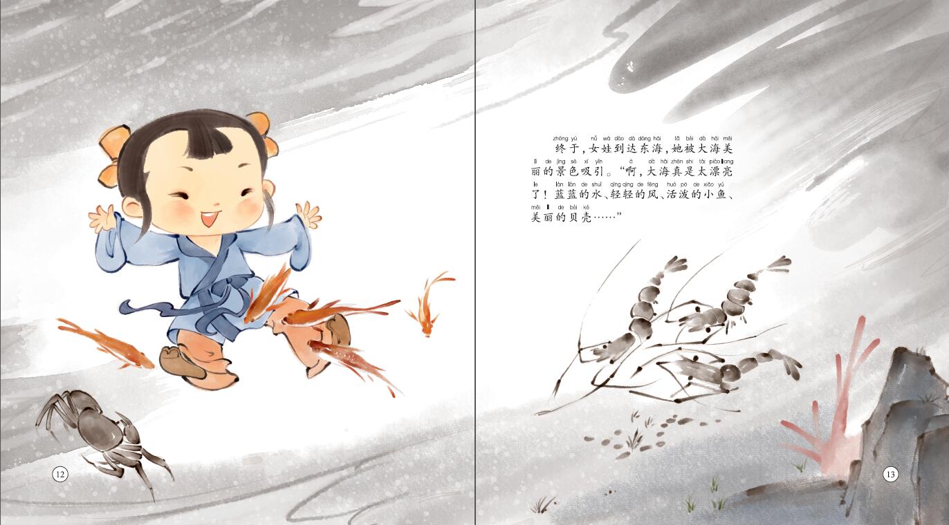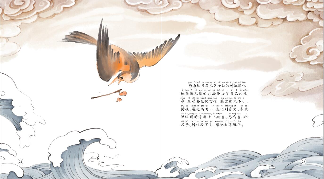 本书根据中国民间传说改编而成。讲述了炎帝的女儿精卫在海上游玩时被风浪夺去了生命,她愤而化为精卫鸟,锲而不舍地衔来小石子,要把大海填平的故事。