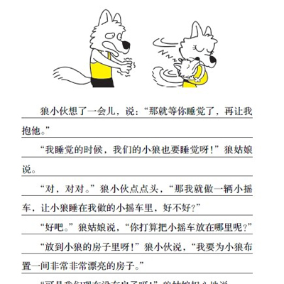 《中国幽默儿童文学经典·笨狼的故事:家庭记》木桩虽然很粗但是有一根向东边歪了一点儿有一根向西边歪了一点儿有一根朝南边倒有一根朝北边倒所以他家的房子现在看上去跟小镇上其他人家的房子有点儿不同。房子大概是因为不知道该向哪个方向倒所以也就没有倒。笨狼说:“山羊先生小伙伴们都不肯来蹋球了。我回家跟爸爸妈妈说:“山羊先生要是看不到我们踢球听不到我们的喧闹声就会晚上睡不着,白天吃不香。爸爸妈妈觉得您太可怜了就同意踉我一起来踢球了。笨狼爸爸听到笨狼的喊声,举着那个写着“团”字的大牌子,不顾一切地从队伍冲出来冲到舞台最前面朝台下喊:“我是笨狼爸爸我为大家唱一首歌:《我的太阳》……啊,多么辉煌……”。