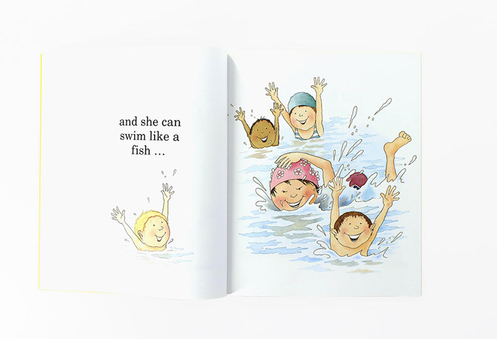 绘本语句简单易懂,如采用she is…, she can…的句式,爸爸妈妈和孩子进行亲子阅读的时候,可以鼓励他们模仿造句,增进亲子交流。同时,绘本中对生活中日常行为的描述,有益于对孩子进行英语启蒙,值得大声朗读。