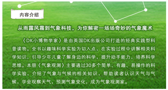 《DK小博物学家》是由英国DK出版公司打造的经典实践型科普读物。全书以趣味科学实验为切入点,在实验过程中讲解相关科学知识,引导少年儿童了解身边的科学,提升动手能力,培养科学思维。本册《气象观测》主要通过30多个简单、有趣、易操作的科学实验,介绍了气象与气候的相关知识,帮助读者认识天气与气候,学会观察天气,预测气象变化,成为气象观测家。
