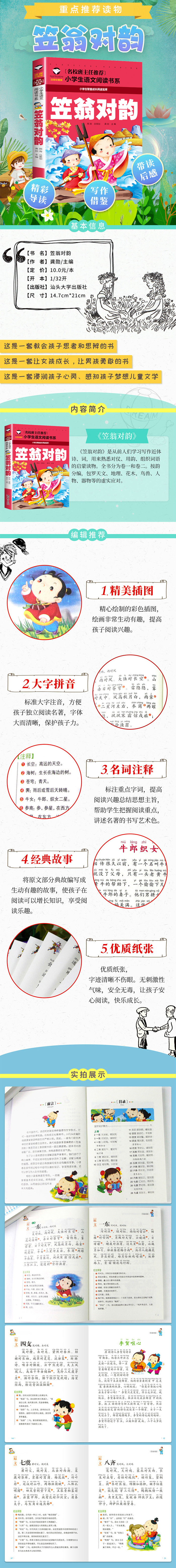 《小学生语文新课标必读丛书·小书虫阅读系列:笠翁对韵(彩图注音版)》精选了一些与内容相关的小故事,让孩子在故事阅读中品味原文所要表述的超凡智慧。富有童心童趣的彩色插图,可以激发孩子的想象力和创造力,激发其阅读兴趣。《小学生语文新课标必读丛书·小书虫阅读系列:笠翁对韵(彩图注音版)》适合中小学生阅读。