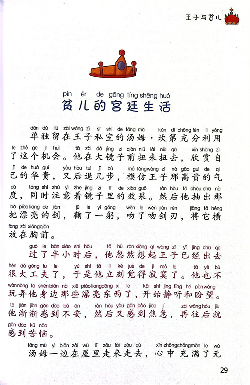 《王子与贫儿》描写王子爱德华和贫儿汤姆在一个阴差阳错的偶然机会下,互相换了位置,王子变成了贫儿,贫儿成了王子。贫儿因穿着王子的衣服可以在王宫里尽享荣华富贵,还当上了英国的新国王。而真正的王子却在外四处流浪,不得不忍受贫穷和乞丐们的欺凌嘲讽。在好人亨顿的帮助下,爱德华王子经过了重重劫难,改掉了自己的坏习惯,回到了王宫。而贫儿汤姆在良心的谴责下,将不属于自己的王位还给了真正的王子。此后,爱德华成了一位仁慈的君主,和他的子民一起过着幸福的生活。故事的想像极其丰富、语言幽默风趣,在带给儿童快乐的同时,还能极大地激发儿童的想象力和对纯洁、善良、美好事物的向往。