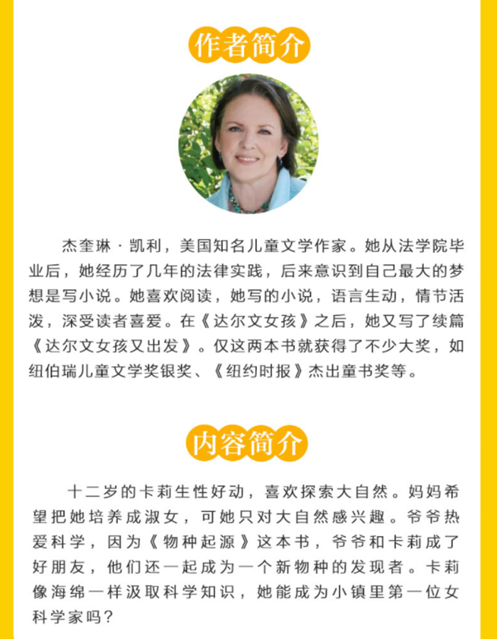 《达尔文女孩》一经出版便吸引了公众的目光,并获得纽伯瑞儿童文学银奖,在报刊媒体和世界各国的读者中获得广泛好评。 本书讲述了一个女孩探索大自然并在此过程中寻找理想、发现自己价值的故事。告诉读者不要害怕与众不同;像海绵一样汲取科学知识丰富大脑;重要的是,不放弃自己的梦想。 本书被亚马逊官方网站评为“教师精选”图书,书中的语言妙趣横生,让读者感同身受,更能引起同龄人的共鸣,非常适合班级共读和讨论。 书中卡莉这一人物形象,有梦想,有激情,敢于并善于表达自己的观点,能够巧妙化解自己的爱好与父母期望的冲突,是值得当代青少年学习的榜样。 本书通过热爱自然的卡莉和崇尚科学的爷爷成为忘年交以后发生的种种趣事传达出不少科学理念,如尊重事实,保持客观,通过实验得出合理结论等等,可以给读者以启发。