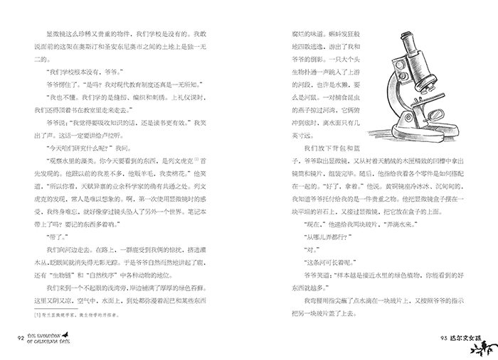 卡莉生性好动,喜欢探索大自然;爷爷眉毛粗浓,长得像条恶龙,所有人对他敬而远之。但因为《物种起源》这本书,爷爷和卡莉成了科学探索之路上的好朋友。爷爷作为卡莉的领路人,带着她走进了一个全新的世界,教会她尊重事实,独立思考。他们在树林里观察昆虫,偶遇可爱的小鹿,甚至还发现了一株野豌豆的变种,并经过专业协会鉴定后,以自己家族的名字为其命名。尽管母亲一心想要将卡莉塑造成一名淑女,她的内心已在爷爷的启蒙下发生了变化。因而在新世纪来临时,她的信念更加坚定了,决心要在科学之路上走得更远一些。
