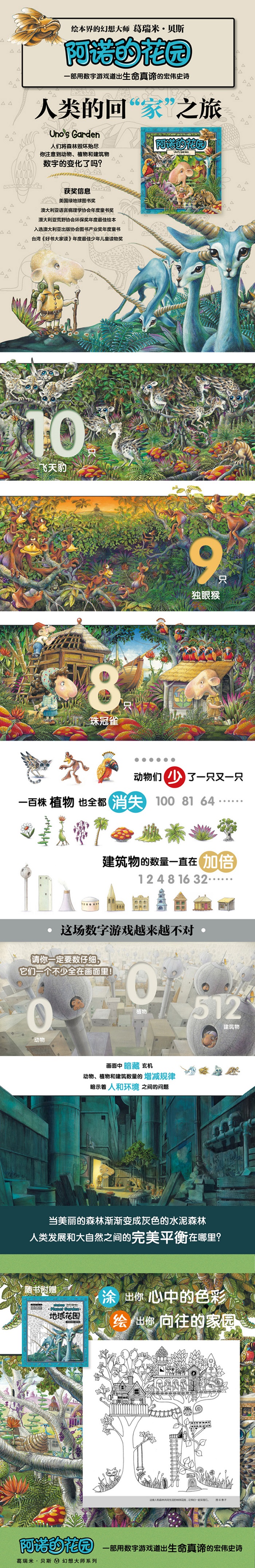 "初春美丽的,阿诺来到了森林。森林里有许多奇异迷人的动物和植物,还有一只毫不起眼的喷鼻猪。阿诺深深地爱上了这片森林,他决定从此生活在这里。不久,其他的人也来到这里,一座小村庄慢慢形成了。村庄变成小镇,小镇变成城市,森林却越来越小。动物一只只变少,植物一株株都消失了…… 《阿诺的花园》是葛瑞米·贝斯“丛林三部曲”的终篇。继《来喝水吧》《阿吉的许愿鼓》之后,这位靠前知名绘本作家又创造了一个魔幻的森林世界。作者巧妙结合了故事书、游戏书、与数字书的元素。画面中暗藏玄机,动物、植物和建筑数量的增减规律暗示着人和环境之间的问题。当美丽的森林渐渐变成灰色的水泥森林,人类发展和大自然之间的完美平衡在哪里?"
