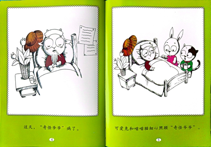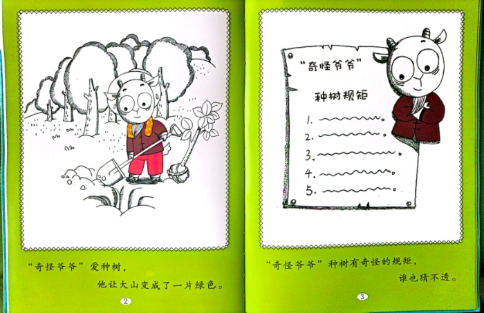 山下住着一位山羊爷爷,动物们都叫他“奇怪爷爷”。奇怪爷爷”爱种树,他让大山变成了一片绿色。这天,“奇怪爷爷”病了。壮壮牛和威威虎来帮忙种树。“奇怪爷爷”却给他们出了个难题:6棵树要栽3行,每行栽3棵。“奇怪爷爷”的想法,大家猜不透!还是去找聪明的小老鼠丹尼吧!他一定会有办法。瞧,连“奇怪爷爷”都满意。