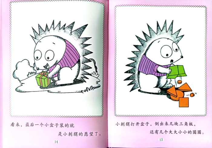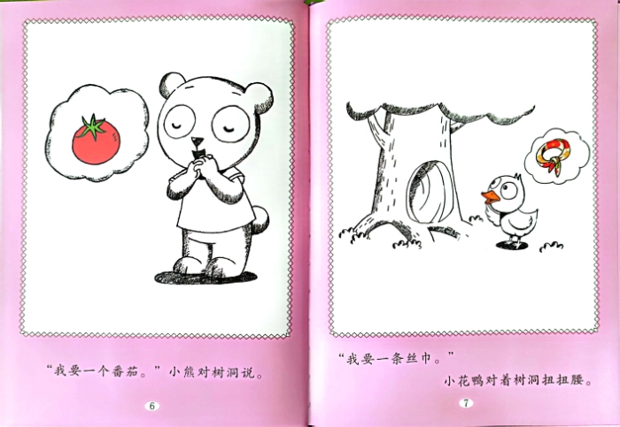 树洞变成了魔法师。它给花栗鼠送了糖葫芦。给小兔子送了帽子。“我要一个土豆。”小獾对树洞说。“我要一个蕃茄。”小熊对树洞说。“我要一条丝巾。”小花鸭对着树洞扭扭腰。“我要一双花瓣鞋。”丹尼抬着脚丫对树洞说。第二天一早,大家一起跑向树洞。小獾抱到了土豆。小熊举着大蕃茄。好漂亮的丝巾!小花鸭立刻系到脖子上。不用说,精巧的花瓣鞋就是丹尼的。*后一个小盒子是小刺猬的愿望了。里面放着几个拼图块。“不是,我不是要这个。”“别急,也许是这样!”丹尼拼出了一个木偶。“树洞真灵,是我要的!”小刺猬破涕为笑。