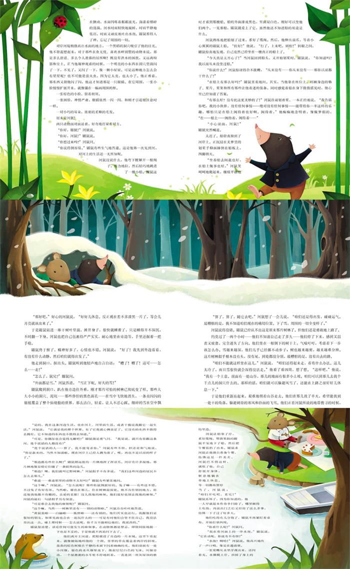 《柳林风声》是一部充满田园牧歌风情的经典童话,书中讲述了四个要好的动物朋友——鼹鼠、河鼠、獾和蛤蟆在风光旖旎的河畔所经历的曲折刺激的冒险故事。作品中扣人心弦的情节设置,细腻入微的描写成功塑造了活灵活现的动物形象,那忠厚善良的鼹鼠、聪明热情的河鼠、老成持重的獾、冒失疯狂的蛤蟆都给读者留下了深刻的印象,而他们在河畔柳林间结下的真挚友情也打动了一代又一代孩子的心。