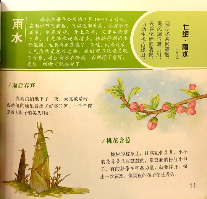 书中不仅文字轻松优美,插图精致美观,还配有传说故事、古诗游戏等趣味板块,十分适合家长、老师与孩子们共读,对于传统文化启蒙和自然科普都极好的读物。