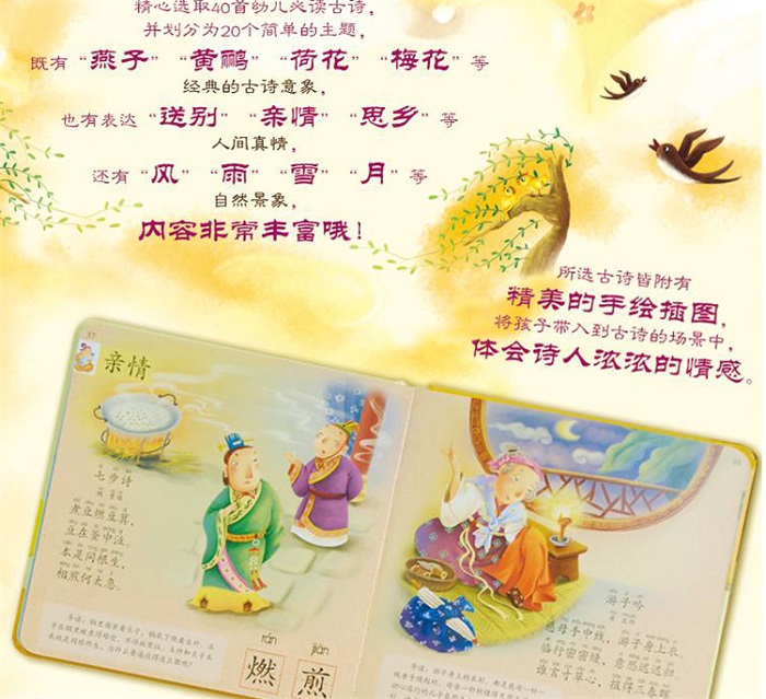 一般说,古文超出了孩子的理解能力,他们的兴趣不会很大,但本书采用多媒体发声朗读的设计,能很好的吸引宝宝的注意力,同时因为古诗合辙押韵,音律优美,朗朗上口,以音频方式播放出来会给人听觉上的享受,所以会让孩子产生很大的学习兴趣。在孩子喜欢的前提下就能坚持听下来,尽管陌生词汇很多,但孩子喜欢听新鲜事物的愿望却得到了较大的满足,在此基础上,会激发孩子的阅读愿望和养成阅读习惯。