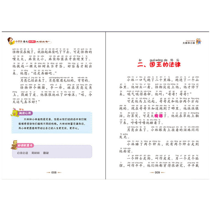 《大林和小林》:大林和小林是一对双胞胎。由于父母双亡,一起外出工作,不同的际遇让大林变成了一个好吃懒做的寄生虫,*后饿死在金子堆里。而小林勇敢正直,成长为一个有出息的好孩子。这个故事揭露了旧社会统治阶级的昏庸无耻和他们对劳动人民的残酷压迫,同时表现了劳动人民为了追求光明而顽强不屈的斗争。