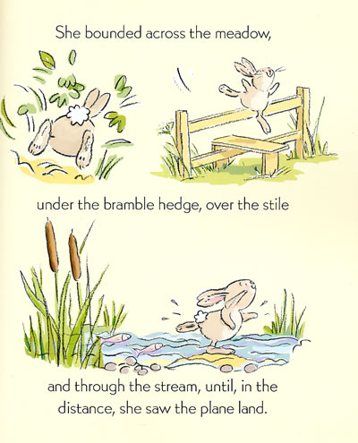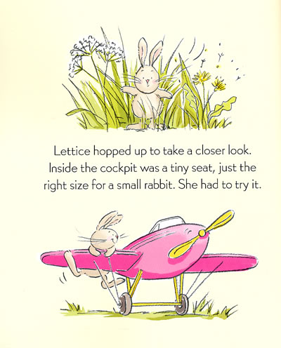 somehow or other she will...She tries flapping her arms and even flapping her ears but no matter how hard she tries she can't lift off the ground. But then Lettice hears a whirring sound and she sees a small plane flying overhead. Lettice follows the plane until eventually she sees it land. It is just the right size for a small, plump rabbit and Lettice can't resist trying the little seat. Suddenly the plane makes a loud rumbling noise. It lurchs forward and jolts...up...up...up...into the sky...beginning the most exciting adventure of Lettice's life!