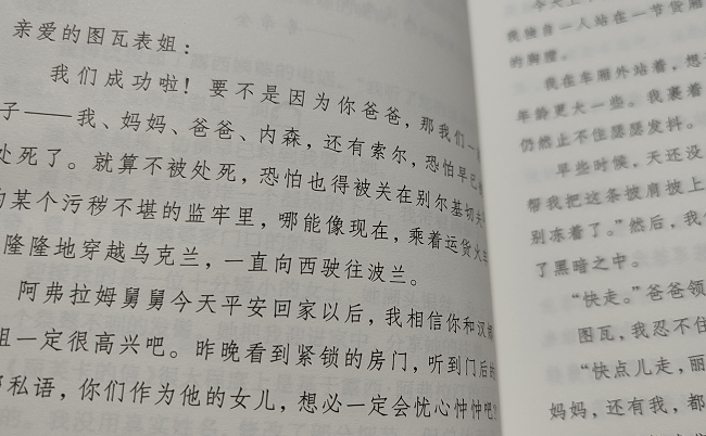 1919年9月2目 于俄国 亲爱的图瓦表姐: 我们成功啦!要不是因为你爸爸,那我们一家子——我、妈妈、爸爸、内森,还有索尔,恐怕早已被处死了。就算不被处死,恐怕也得被关在别尔基切夫①的某个污秽不堪的监牢里,哪能像现在,乘着运货火车轰隆隆地穿越乌克兰,一直向西驶往波兰。 阿弗拉姆舅舅 平安回家以后,我相信你和汉娜表姐一定很高兴吧。昨晚看到紧锁的房门,听到门后的窃窃私语,你们作为他的女儿,想必一定会忧心忡忡吧? 露丝外婆,我亲爱的外婆,她很快便会得知我们成功出逃的消息了。用奶牛阿福产的奶做成的奶油那么好吃,我想露丝外婆应该满满装一大罐,好好犒劳犒劳阿弗拉姆舅舅。还有什么谢礼比阿福的奶油 好呢? 上午,在火车站里,太阳已经爬上大树的 。我独自一人站在一节货厢外,心脏怦怦怦地冲击着我的胸膛。 我在车厢外站着,想让自己看起来比十二岁的实际年龄 大一些。我裹着汉娜表姐送给我的新披肩,却仍然止不住瑟瑟发抖。 早些时候,天还没亮。我们准备出发了,汉娜一边帮我把这条披肩披上,一边在我耳边小声说:“披上,别冻着了。”然后,我们便静悄悄地离开你们家,隐没在了黑暗之中。 “快走。”爸爸领着我们穿过树林,向火车站走去。 图瓦。我忍不住回过头,看了看你们家摇曳的灯光。