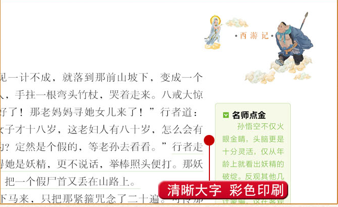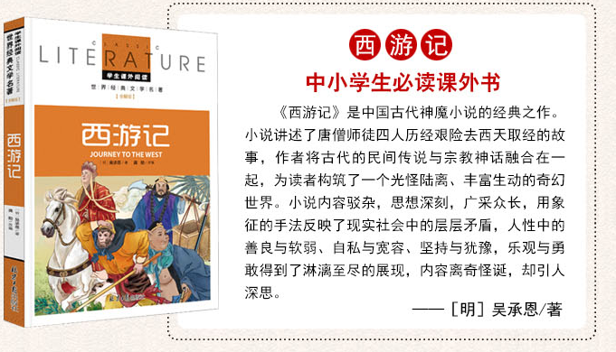 《西游记》是中国古代神魔小说的经典之作。小说讲述了唐僧师徒四人历经艰险去西天取经的故事,作者将古代的民间传说与宗教神话融合在一起,为读者构筑了一个光怪陆离、丰富生动的奇幻世界。小说内容驳杂,思想深刻,广采众长,用象征的手法反映了现实社会中的层层矛盾,人性中的善良与软弱、自私与宽容、坚持与犹豫,乐观与勇敢得到了淋漓至尽的展现,内容离奇怪诞,却引人深思。