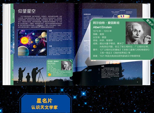 《中国儿童太空百科全书》是一套由天文学家、航天专家和科普作家联合编纂、适合6-15岁儿童阅读的原创科普启蒙百科,包括《浩瀚的宇宙》《太阳系掠影》《飞向太空》《中国航天》4个分册。《浩瀚的宇宙》介绍了恒星、星云、星系、星座等知识,共设置40多个主题页,200多个知识点、300多幅图片,并设有AR增强现实APP,引导读者初步认识宇宙空间和天文现象,将人类对宇宙的观测、发现和认识融入到知识内容中,知识的展现层层递进,以引发小读者的认知和探索兴趣。