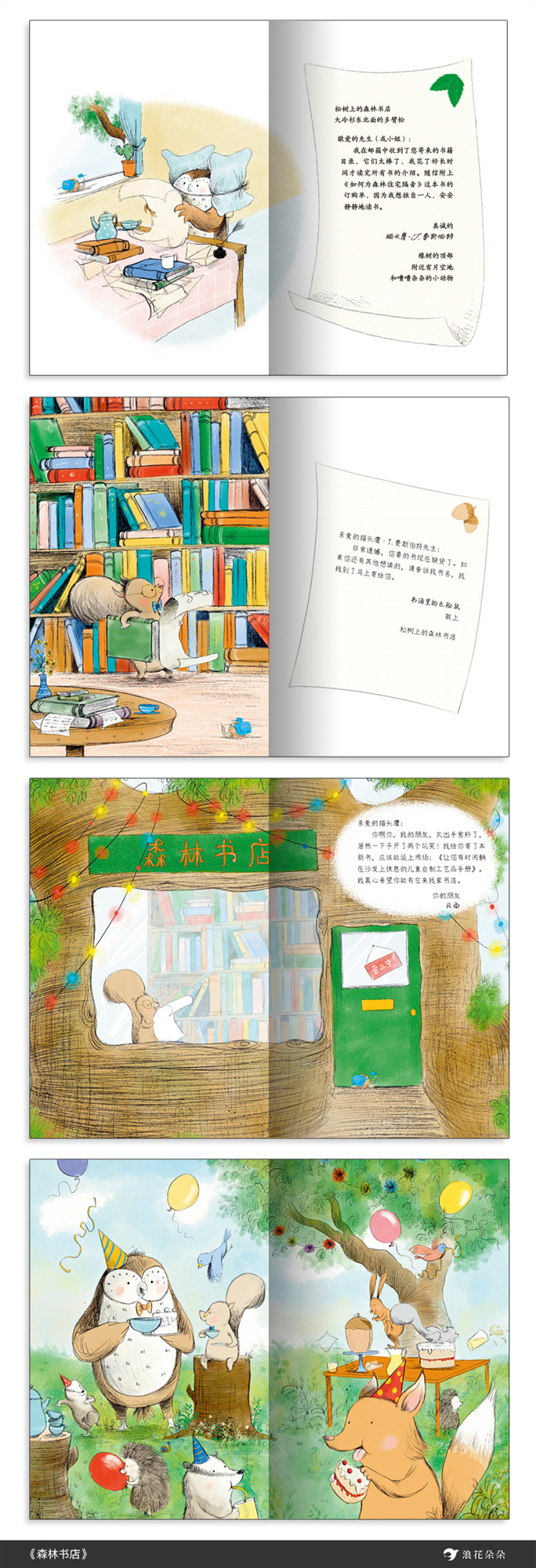 ◎ 独具一格的书信体图画书:让孩子学习理解一种长效的沟通方式 在互联网时代,传统书信早已退出大众视野,取而代之的是“电子邮件”。但从书信到邮件,“信”依然是人们沟通交流、商务往来、求学申请、建立信任关系的重要工具,这本图画书完全以书信的形式讲述,优雅细致的图画与优美睿智的文字共同赞美了书籍、书店、信件与爱。 通过阅读《森林书店》的图画故事,孩子们可以从中感受到阅读的快乐,学习“信”或“邮件”的基本格式,学会用幽默、温暖的语言敲开陌生朋友的心门。 ◎ 儿童版《查令十字街84号》:书店店主与古怪书迷的友谊 孤僻古怪的书迷猫头鹰与耐心智慧的书店主松鼠的故事,任何爱书人读了这个故事都会联想起感人的“查令十字街84号”,正是通过“信件沟通”,书店和读者建立起牢固的关系。 这是献给所有为孩子们的阅读做出贡献的爱书家庭和书店的情书。文字作者朱莉特别提到,这个故事是她写给“独立书店”的情书。书中还能意外“窥探”书店店主的职业秘辛:如何给顾客更好地推荐图书——从关心读者真正的需求和生活开始。 ◎ 创造团结有爱的理想社区:有书店的地方更令人向往 故事中的森林是一个城里的人都想搬来的地方,这里邻里和睦、学习共享,这里有书店、有孩子、有爱、有创造力,是一个即使像猫头鹰这样孤僻古怪的家伙也能找到朋友的理想社区。 环衬是森林地图,每页图画都隐藏有细节,孩子们可追踪小小蜗牛邮递员的踪迹,还可以跟着故事里的小动物们一起学习举办自己的聚会,制作菜单和写邀请卡。