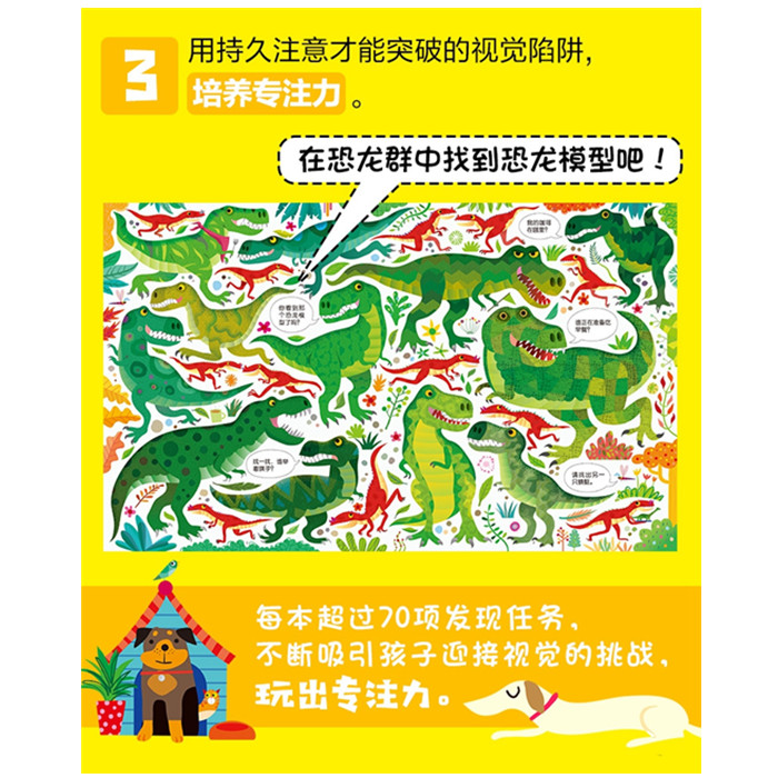 这是一套为4-6岁儿童打造的专注力培养游戏书,共六册。包括丛林、动物园、海底世界、农场、恐龙、猫咪和小狗等六大主题,100个趣味情景,400多项视觉发现游戏,在找一找、配一配、数一数的形式中,玩出观察力和专注力,促进逻辑思考力。《动物园》这本书以孩子们感兴趣的动物园为主题,构建出16个趣味场景79项游戏。有海豚表演图、猴子嬉戏图、企鹅滑冰图等等,融合了拓展情境认知、提升观察力和专注力等多项益智功能。在充满童趣的画面中让孩子找一找、配一配、数一数,轻松培养专注力,同时可爱的动物形象还能唤起孩子对生命的关爱。