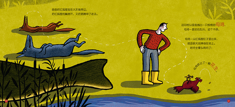 有一个小男孩和爸爸生活在一起。有一天,爸爸准备带小男孩出去钓鱼。可是小男孩等啊等啊,爸爸总是有忙不完的事儿。最后他不耐烦了,藏在了一颗花生里,然后依次被母鸡、红狐狸、大灰狼和大鲶鱼吞进了肚子里。爸爸通过努力,终于将他解救了出来。
