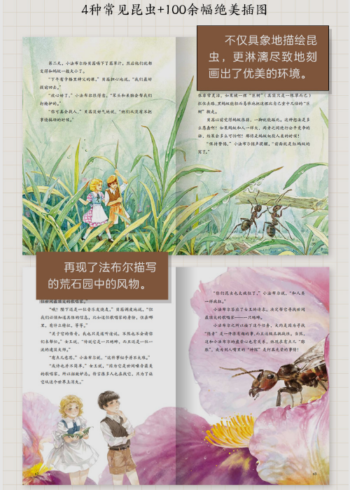 《小法布尔的昆虫世界》是以经典名著法布尔《昆虫记》内容为蓝本创作的全新故事,它讲述了主人公小法布尔化身“昆虫侦探”,在昆虫世界探案、历险的故事。本书精选了孩子们熟悉的蚂蚁、蟋蟀、蝗虫、蜻蜓4 种昆虫,在故事中,小法布尔借助听懂虫语的神奇能力和变大变小的魔法药水,帮助红蚂蚁找回孩子,在昆虫女王的委托下寻找的歌唱家,变身半虫人,乘坐蜻蜓在恐龙世界冒险。 作者用丰富的想象力,将细致严谨的科学知识融入曲折有趣的冒险故事,使之成为更适合中国儿童阅读的全新版本,轻松培养孩子的阅读兴趣,引发孩子对昆虫世界的好奇。100余幅绝美插图,不仅仔细描绘了蟋蟀的身体结构、蝗虫从卵到成虫的蜕变过程、蜻蜓的羽化,让小读者具象地了解昆虫,更淋漓尽致地刻画出了优美的风景与环境,再现了法布尔所描写的荒石原中的风物。 本书在融入科普知识的基础上,还体现了值得孩子学习的锲而不舍的科学探索精神,传递了对生命和自然的尊重与热爱。