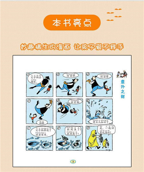 《父与子漫画成语》是将德国著名的漫画家埃·奥·卜劳恩创作的一系列漫画故事《父与子》和中国传统文化紧密结合。漫画充满了人性的温情和幽默,成语简短精辟并富有深刻的内涵。《父与子漫画成语》通过漫画和成语两种形式的紧密结合,以轻松、幽默、有趣的方式,生动地刻画了父亲和儿子的生活,洋溢着暖暖的人情味。本书版式新颖,用成语表达漫画的情景,并添加了成语的出处、成语的解释、成语小故事以及成语接龙等板块。并精心配字和着色,让原本黑白画面的故事更加精美,内容更加丰富,给读者带来一种全新的体验,在阅读中感悟、学习、成长、进步。