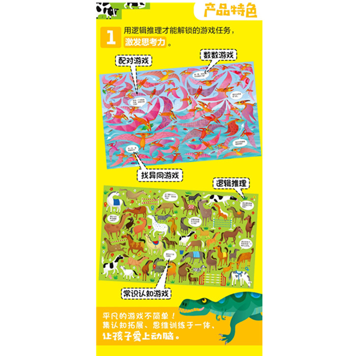 这是一套为4-6岁儿童打造的专注力培养游戏书,共六册。包括丛林、动物园、海底世界、农场、恐龙、猫咪和小狗等六大主题,100个趣味情景,400多项视觉发现游戏,在找一找、配一配、数一数的形式中,玩出观察力和专注力,促进逻辑思考力。《动物园》这本书以孩子们感兴趣的动物园为主题,构建出16个趣味场景79项游戏。有海豚表演图、猴子嬉戏图、企鹅滑冰图等等,融合了拓展情境认知、提升观察力和专注力等多项益智功能。在充满童趣的画面中让孩子找一找、配一配、数一数,轻松培养专注力,同时可爱的动物形象还能唤起孩子对生命的关爱。