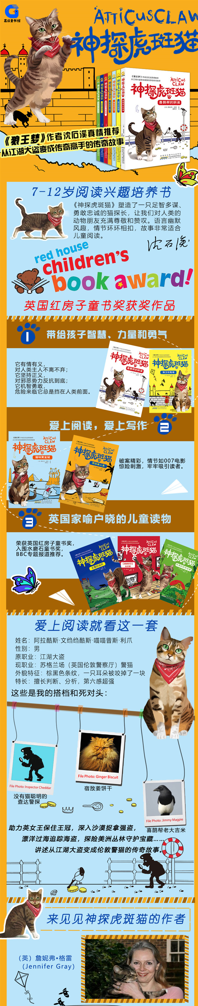 本套书共7册,为英国作家詹妮弗·格雷创作的一套动物侦探小说,在英国家喻户晓。主人公是一只耳朵缺了一块、戴着红围巾的虎斑猫,讲述了它从一个纵横江湖的猫大盗变成了破案高手的故事。每本书都有不同的探险、破案地点,融合动物、冒险、侦探、悬疑等元素,故事充满想象力,情节跌宕起伏,在善与恶、美与丑的对决中,告诉小读者什么是正义、勇气和智慧。本系列的第一本入围2013年水磨石奖,获得2014年英国红房子童书奖。本书为其中一册。勋爵庄园举办的胡子针织衫大赛上,神秘的大胡子海盗船长突然闯入,可怜的查达警探受到了致命诅咒。为了拯救查达的性命,神探虎斑猫和伙伴们开始了海上冒险,寻找传说中的“欲望之匣”和美人鱼。死对头女特工一行却再次出现,与海盗一伙联手,试图抢先找到美人鱼。眼看诅咒的最后期限即将到来,神探虎斑猫能够力挽狂澜吗?