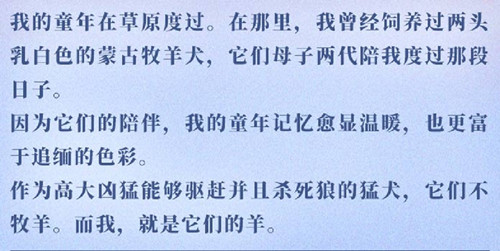 我的童年在草原度过。在那里,我曾经饲养过两头乳白色的蒙古牧羊犬,它们母子两代陪我度过那段日子。因为它们的陪伴,我的童年记忆愈显温暖,也更富于追缅的色彩。作为高大凶猛能够驱赶并且杀死狼的猛犬,它们不牧羊。而我,就是它们的羊。