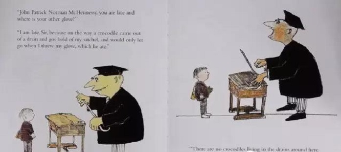 书中老师与学生两个角色,透过幽默而鲜明的图画,将两人一来一往的互动清楚的传达出来。从家里出发,走路去上学,到进入教室这样一个在单纯不过的事件,因为一个个匪夷所思的状况而带来意想不到的改变。这当中耐人寻味的前因后果,就留待读者细细咀嚼了。