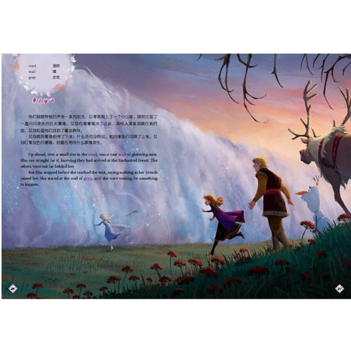 《冰雪奇缘2双语故事(官方电影版):魔法森林的秘密》一册讲述了: 艾莎、安娜等人跟随神秘的声音来到了魔法森林中。姐妹俩小的时候父亲给她们讲过一个故事,在故事中出现的北境大坝和曾经的北境人、阿伦黛尔人,都出现在了魔法森林中。更神奇的是,她们还遇到了三个自然精灵。为了解救森林中被困的人们,让阿伦黛尔恢复原状,艾莎等人决定立刻继续向北走......