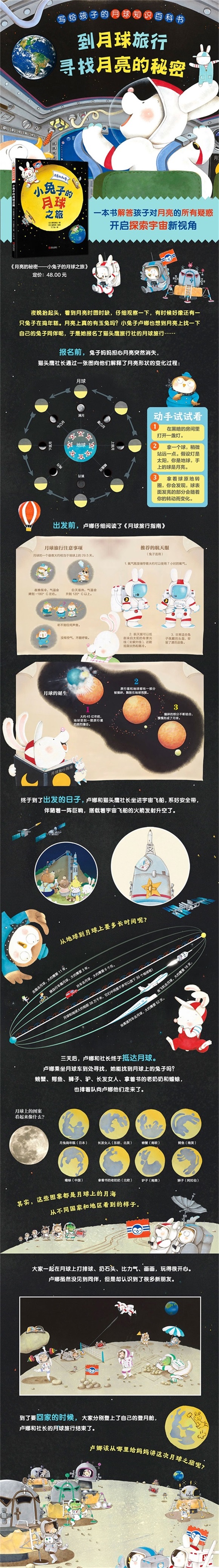 这是一本饶有趣味的故事类科普绘本,兼具故事性、科学性、趣味性于一体。以小兔子卢娜去月球旅行的故事为线索,生动详尽地阐述了月食、月相、地月关系、潮汐现象、月球诞生、月球传说等与月球相关的知识,画风清新可爱,知识点丰富,讲述方式贴近孩子心理,易于接受。