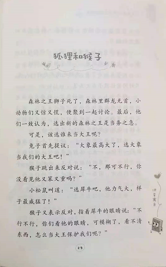 《狼和鹭鸶》——狼误吞下了一块骨头,十分难受,四处奔走,寻访医生。狼遇见了鹭鸶,谈定酬金请鹭鸶帮自己取出骨头,鹭鸶把头伸进狼的喉咙里,叼出了骨头,便向狼要定好的酬金。狼大声训斥鹭鸶不该跟自己要报酬。
