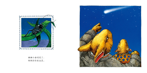 嘘!宝贝宝贝小声点,妈妈带你看蜂鸟。要是蜂鸟飞走了,妈妈陪你看晚霞。要是晚霞回家了,去听蛐蛐唱小曲。要是蛐蛐唱完了,妈妈陪你看流星。要是流星不见了,妈妈给你讲故事……