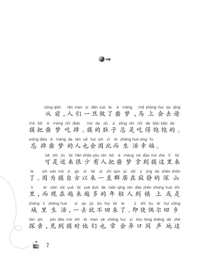 这天,老松头儿兴奋地跑到存梦银行的柜台前说:“我做了一个好梦,想要续梦。本想早点过来,但因为要带一个作为手续费的噩梦,所以才拖到现在。” 貘太郎笑盈盈地迎接了他。“做了噩梦马上拿来就好,好梦随时可以续长,您每天都可以来。” 貘太郎察看了老松头儿带来的梦:一个下大雨的梦,一个举办婚礼的梦。貘太郎没多想便吃了下雨梦,并开始续婚礼梦。在梦中,老松头儿可爱的孙女身穿金线织花锦缎的嫁衣,正要骑马出嫁。 不能把马变成汽车,更不能变成新娘子开车……貘太郎小心翼翼地从头到尾仔细察看了一遍,然后把马鬃梳理好,又把新娘子手里拿着的扇子镶上了珍珠。 谁知,老松头儿第二天大失所望地跑到了存梦银行,“貘太郎,你可不能把梦给搞错了呀。你把好梦给吃掉了,而噩梦变得更糟了……” 貘太郎大吃一惊,“怎么会呢?我是把下雨的噩梦吃掉了,又把出嫁的好梦加长了啊……”