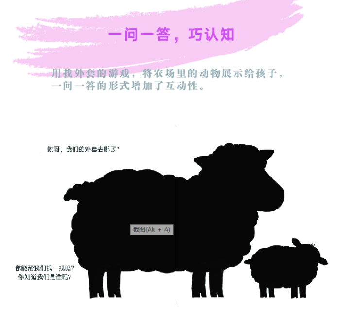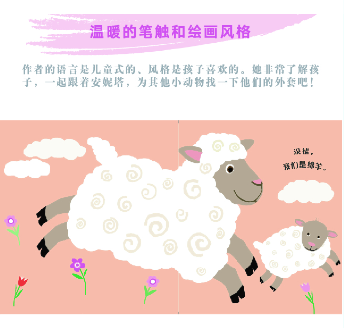 农场里的动物,他们的外套不见了,需要孩子们的帮助,孩子们能帮助他们找到外套吗?本书巧妙的利用了绘本翻页的功能,将农场里的动物展示给了孩子,一问一答的形式又增加了本书的互动性。并且,作者根据孩子视觉发展的生理特点,利用画面中黑白向彩色的过度,增加了孩子对书中知识点的记忆,培养孩子学会观察。