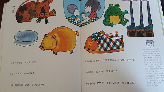 二 本书鼓励孩子亲身体验:本书为小朋友设计了许多“自己动手作”的单元,可培养他们积极进取的精神。在每一节内容结束时,专设“探索”一栏,对孩子在学习过程中,可能会产生什么反应;学习到某一阶段,会有什么进展;以及父母在与孩子共同学习时,应抱着什么心态,又应如何指导孩子的行为等等,都作了详尽的解答。栏目中分别用红色圆点标记和蓝色圆点标记,红色圆点部分的提示是针对1-3岁的儿童的,蓝色圆点部分的提示是针对4-6岁儿童的,父母可以根据提示辅导儿童进行阅读。父母可以根据具体情况以及孩子的兴趣所在进行辅导。