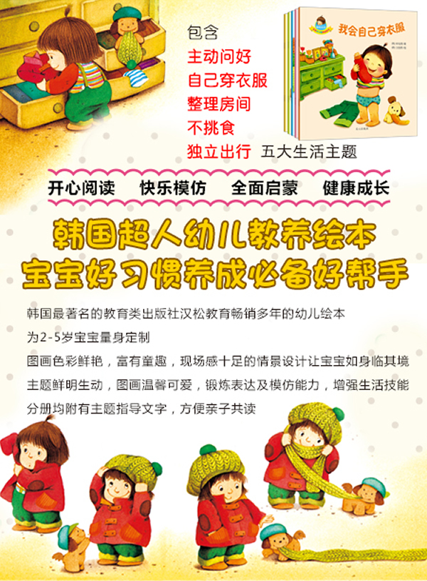 《看图说话.宝宝好习惯养成系列》是韩国著名的教育类出版社汉松教育畅销多年的低幼绘本,图画色彩鲜艳,富有童趣,故事适合此年龄段儿童的心理特点,包含“打招呼”、“自己穿衣服”、“不挑食”、“自己去朋友家”等认知内容,通过对小主人公有趣的生活小故事的描写,让孩子们在尽情享受阅读快乐的同时,开始接触社会的雏形,学会认识自我,懂得一些做人做事的道理,教他们练就跨入真实世界的能力,并促进他们良好习惯的形成,为其日后的成长打下良好基础。