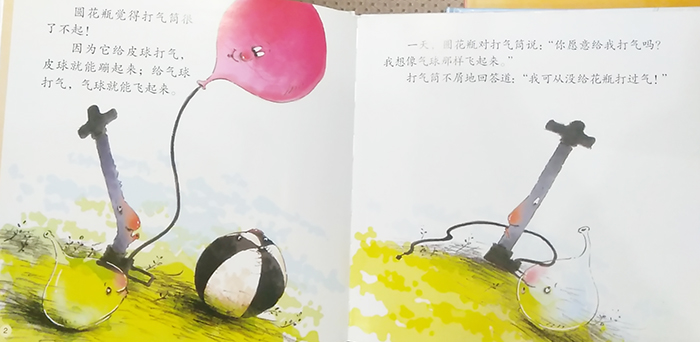一天,圆花瓶对打气筒说:你愿意给我打气吗?