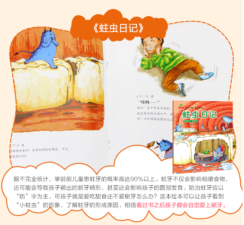 模样像小怪兽一样的小蛀虫很喜欢爱吃甜食又不爱刷牙的小孩啦!它钻进安卡的嘴里,在他的牙齿上打洞,舒舒服服地住了进去。它还叫来了一群蛀虫朋友,在安卡的嘴里玩儿呀、闹呀,可把安卡折腾惨了……