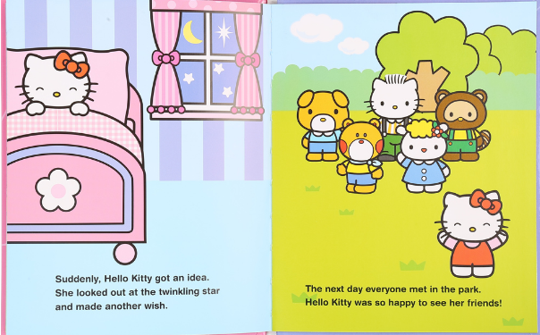 一天晚上,Kitty注意到在漆黑的夜空中有一颗格外亮眼的星星,一闪一闪多漂亮呀。站在门廊上的Kitty遥望着这颗星星,为她的每一位朋友许愿……