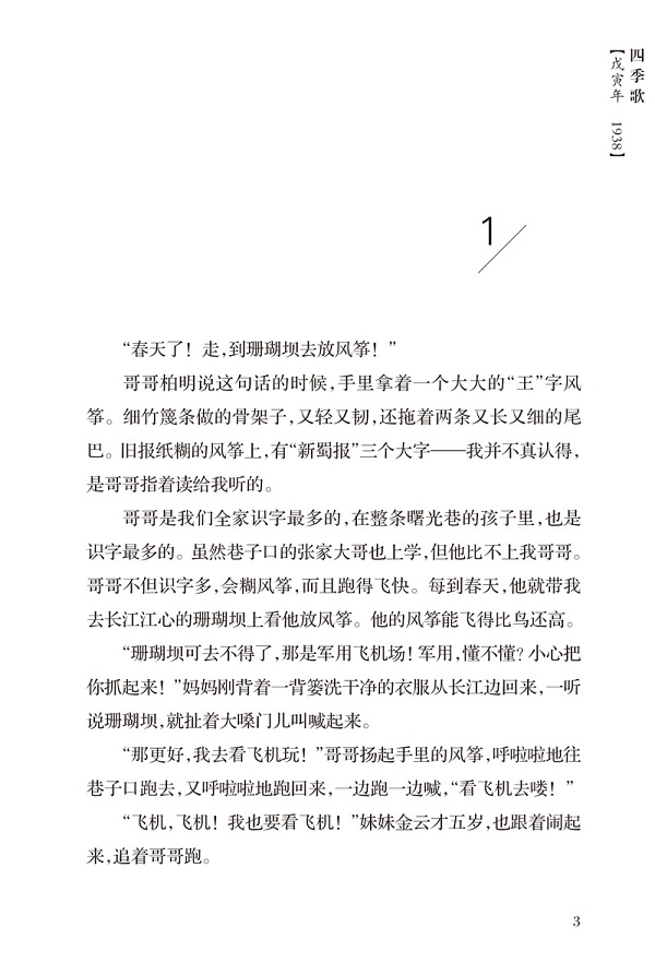 纸飞机比赛是10岁的杨柏明和妹妹金兰、金云最热衷的游戏。1938年10月,日军轰炸重庆市区的序幕正式揭开。每年入冬到次年5月,重庆城大雾弥漫,轰炸被迫停止,为重庆老百姓赢得了宝贵的重建时间。五年,孩子们经历了家园被毁、亲人离散、伤痛死亡,懂得了顽强抵抗,乐观生活,学到了坚韧、信念等品格。1942年,轰炸接近尾声。杨柏明在废墟上帮着一家家修起了崭新的房子,孩子们再一次放飞了轻盈的纸飞机……长篇儿童小说《纸飞机》在真实史料的基础上,以1938到1942年日军对重庆战略大轰炸为背景,以儿童的视角多层次地表现中国人民在战争阴霾下的生活与抗争,对和平的向往和希冀,弘扬了坚韧勇毅、团结抗战的民族精神,展现了爱国主义与人道主义精神。