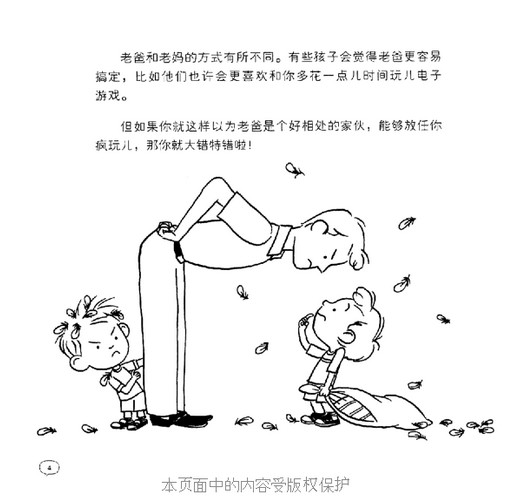 说到这套书——《烦人老妈,我爱你》和《厉害老爸,我爱你》,也曾听到过这样的反馈——孩子们读了会不会真的变成“小大人”,完全没了孩子的天性,整天就知道猜测爸爸妈妈的心理呢?其实,爸爸妈妈多虑了。孩子年龄小,但是他们的心灵和大人一样,甚至更敏感、脆弱,更渴望得到老爸老妈的理解和关爱。而埃里克·格里温用简洁的语言讲述了自己和同龄人的困惑,也向同龄人传达了一个讯息——老爸老妈的爱对孩子的 爱是无条件的,理解的前提是爱,而理解的途径是沟通。