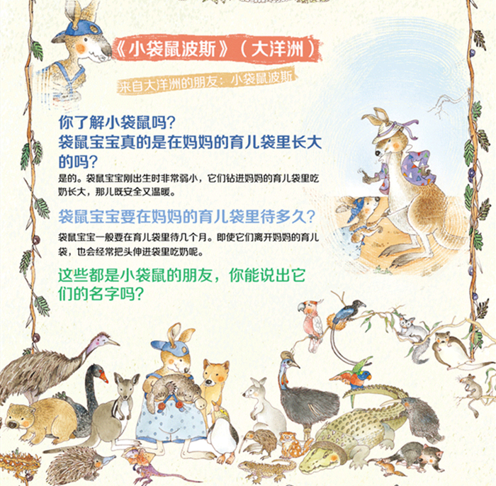 本丛书共6册,《小象丽丽》《小河狸奔奔》《小食蚁兽乔希》《小狼哈利》《小袋鼠波斯》《小老虎西莉亚》,每册以一种动物为主人公,以故事的形式讲述这种动物的特点、习性和生存自然环境。不仅将动物的科普知识点自然地融进故事情节中,又结合故事内容,以问答的形式更全面地介绍相关科普知识。图书装订形式独特、新颖:每册书各有两页胶片页,透明部分和前页、后页的画面很好的结合起来;每册书还设计有翻翻页。这样的装订形式,让孩子翻阅图书时,感觉更新奇,更有趣,爱不释手。