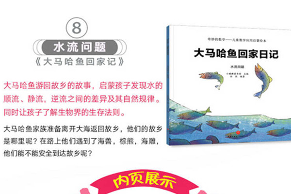 大马哈鱼游回故乡的故事,启蒙孩子发现水的顺流、静流,逆流之间的差异及其自然规律。同时让孩子了解生物界的生存法则。