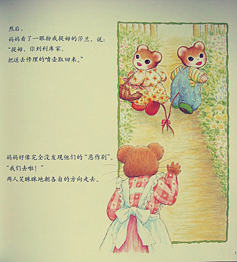 提姆和莎兰玩起了“恶作剧”,提姆扮成莎兰,莎兰扮成提姆,看看能不能一整天都不被人发觉。可好朋友苏珊却发现了一个破绽,而爸爸、妈妈更是神不知。鬼不觉地认出了他两。这是一次小小的冒险,更是爱与关怀的最好见证。