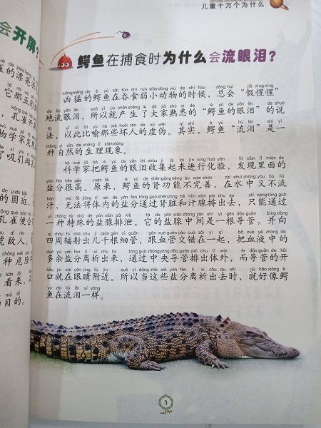 为什么狗的鼻子特别灵敏、狗为什么喜欢摇尾巴、猫为什么在白天睡觉晚上抓老鼠、白兔的眼睛为什么是红色的、鸭子走路时为什么一摇一摆、驴为什么喜欢在地上打滚为什么牛不吃东西也要咀嚼、马为什么要站着睡觉、猪真的 《幼儿十万个为什么》 很愚蠢吗、壁虎为什么会弄断自己的尾巴、壁虎为什么能“飞檐走壁”、变色龙为什么会变色、蛇为什么能吞食比头部大很多的东西、响尾蛇的尾巴为什么会响、为什么说蝙蝠是听觉冠军、大雁在飞行时为什么要排成队……